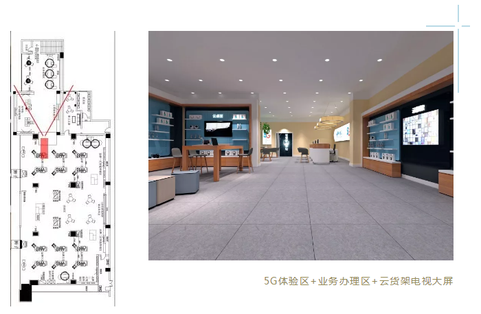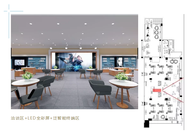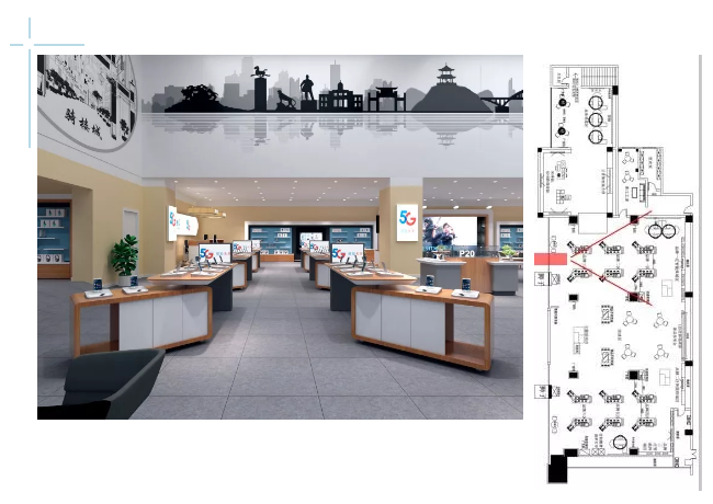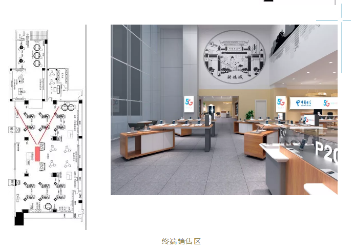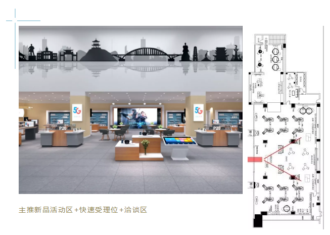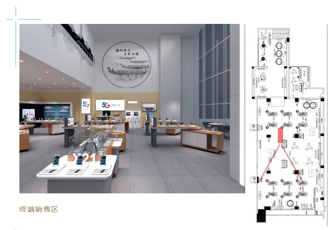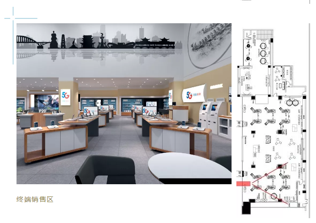 在功能分區(qū)方面,空間采用分區(qū)不區(qū)分的輻射設(shè)計(jì):輻射型分區(qū)覆蓋原有的所有功能,各功能區(qū)無縫連接。以終端體驗(yàn)為核心,休閑與服務(wù)體驗(yàn)分散于周邊,在終端體驗(yàn)區(qū),實(shí)現(xiàn)終端體驗(yàn)、套餐定制、購買、流量定制一體化;在休閑服務(wù)區(qū),實(shí)現(xiàn)驗(yàn)機(jī)、下載、娛樂、休息一體化。