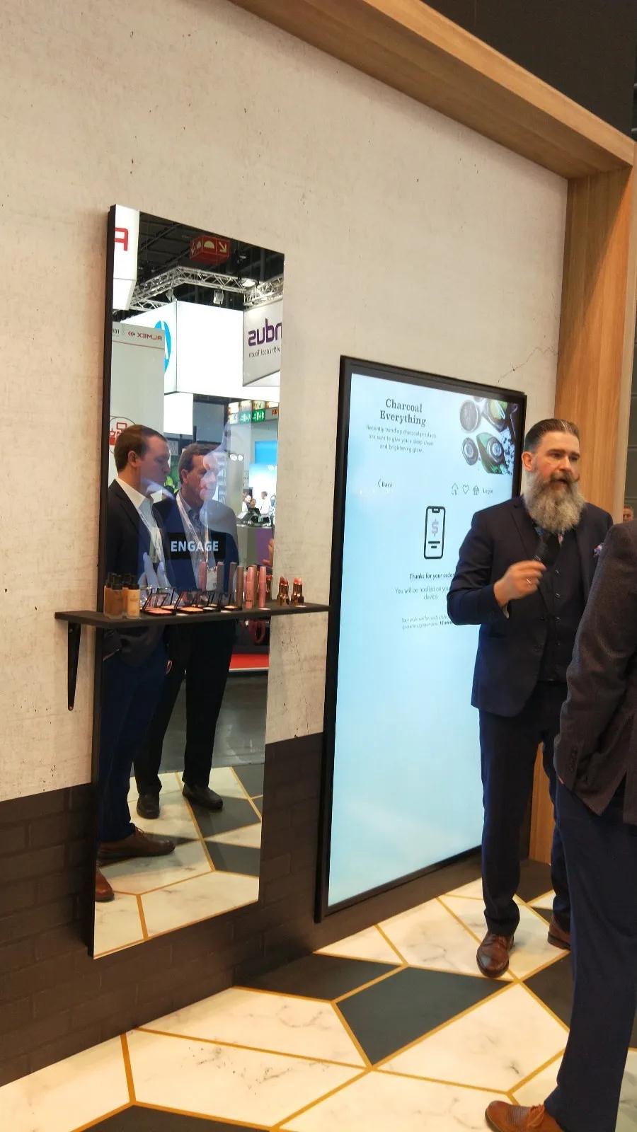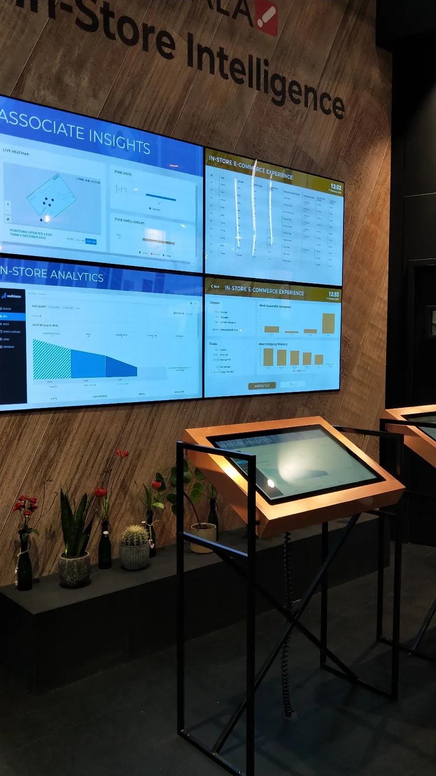 在它的旁邊是一款智能貨架,兩個層板上的產(chǎn)品均可以顯示價格,同時當(dāng)產(chǎn)品位置發(fā)生變換的時候,價格也跟著調(diào)整。背面是一整塊大屏幕,閑時播放產(chǎn)品廣告遠(yuǎn)距離傳播,當(dāng)有產(chǎn)品被拿取的時候大屏幕會以畫中畫的形式展示所拿取商品的信息。