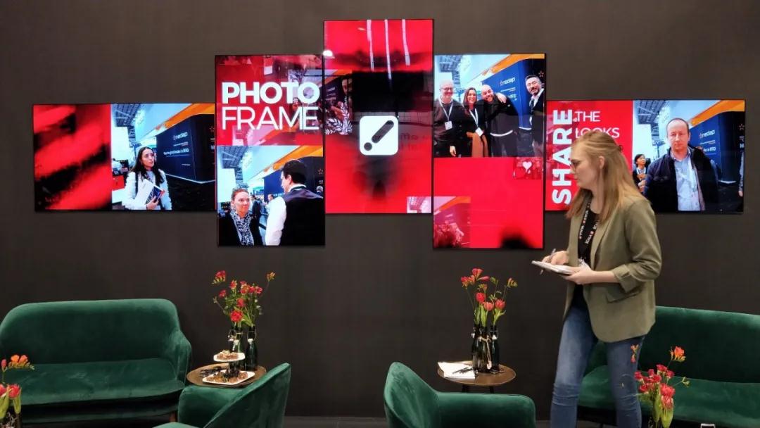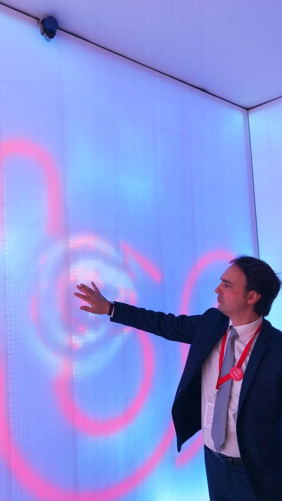 這組屏幕拼接方式很獨(dú)特,每塊屏幕大概只有10毫米的厚度。實時捕捉著現(xiàn)場參與體驗的人群。