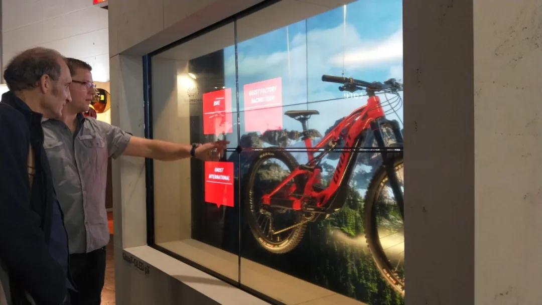 屏幕在零售店面設(shè)計中占據(jù)著舉足輕重的地位,是視覺傳播的主要陣地。LG品牌占據(jù)著主要的市場。鏡面屏、透明屏以及他們組成的拼接屏越來越得到廣泛的應(yīng)用。由四塊透明屏組成的櫥窗,兼具觸摸功能。當(dāng)人在距離兩米以上時顯示廣告(不透明),兩米以內(nèi)則變?yōu)橥该黠@示里面的自行車,同時觸摸上面的顏色模塊展示產(chǎn)品的各項信息數(shù)據(jù)。