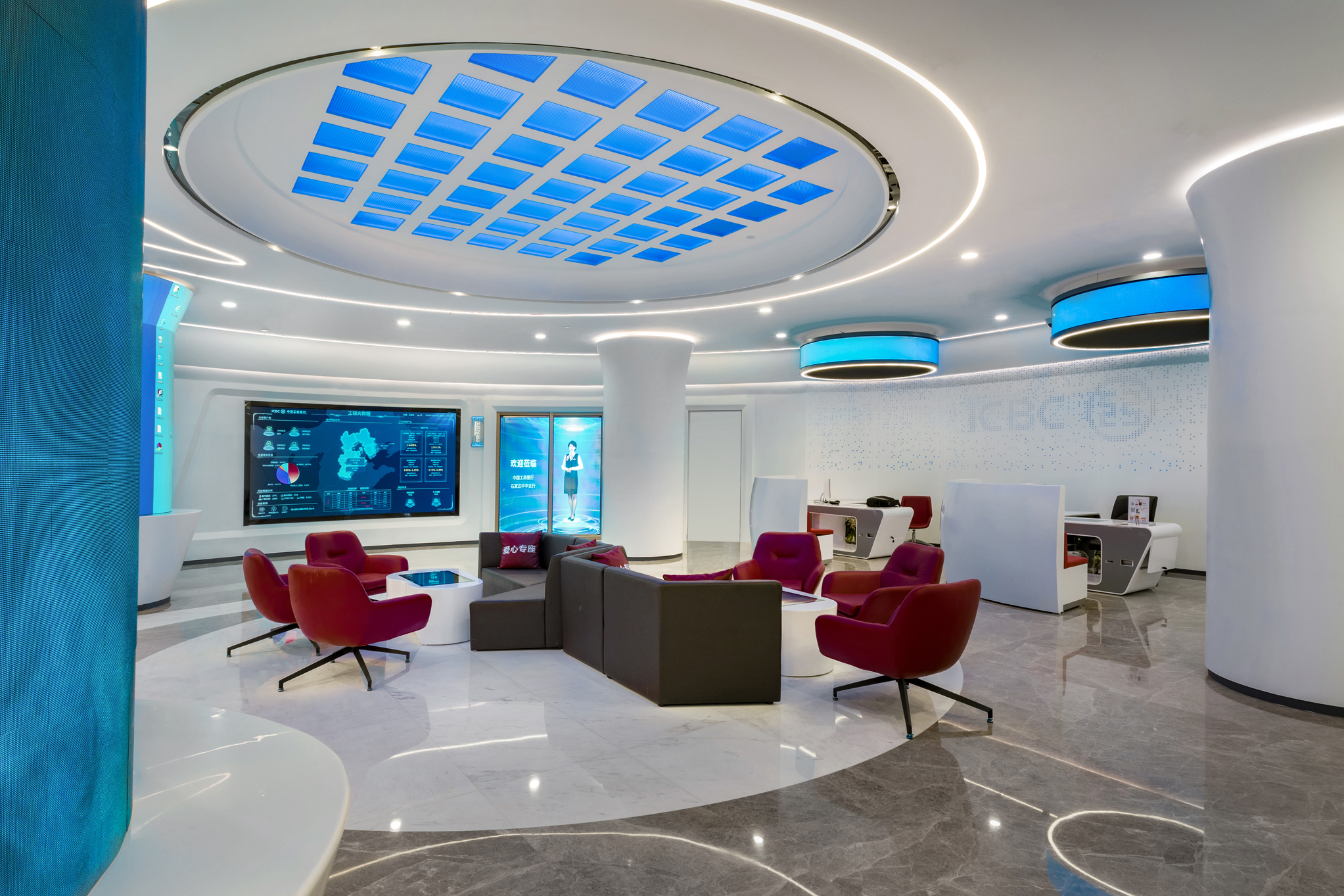 近日,由常宏提供設(shè)計服務(wù)的中國工商銀行河北分行首家5G技術(shù)智慧銀行骨干網(wǎng)點——石家莊中華支行營業(yè)室正式亮相。重裝開業(yè)的中華支行營業(yè)室運用大數(shù)據(jù)、物聯(lián)網(wǎng)、人工智能、生物識別、5G等前沿科技,將金融、社交、生活等場景相連接,為客戶提供多渠道、全方位的服務(wù)和智能化、個性化的消費體驗。