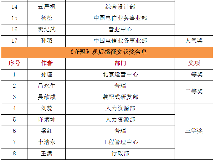 作為兩場(chǎng)征文比賽的評(píng)委之一,常宏品牌推廣部總監(jiān)張英宣向大家介紹了這兩場(chǎng)征文比賽的評(píng)選規(guī)則以及大致情況。常宏“宏鳥”征文大賽自征集以來,共征集了174份參賽作品,經(jīng)過初評(píng)、復(fù)評(píng)、公示,共評(píng)選出了一名一等獎(jiǎng)、兩名二等獎(jiǎng)、三名三等獎(jiǎng)、十名鼓勵(lì)獎(jiǎng)以及一名人氣獎(jiǎng)?!秺Z冠》觀后感征文從87份作品中,共評(píng)選出了一名一等獎(jiǎng)、兩名二等獎(jiǎng)以及五名三等獎(jiǎng)。