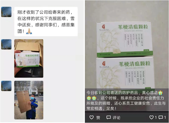 2021年,新冠疫情再度爆發(fā),香港旭日集團及常宏本部心系員工健康,選了經(jīng)過2020年初抗疫前線應(yīng)用的有效藥品「葦梗清瘟顆?!梗ā競浒肝奶枴冠M藥制備:Z20200002000)發(fā)放給全體員工。1月初,常宏將首批顆粒發(fā)放給一線工人,后受疫情影響,在石家莊市快遞恢復(fù)的第一時間,14日起陸續(xù)將藥品以郵寄的形式發(fā)放給全體員工,用于大家預(yù)防新冠肺炎,以實際行動關(guān)心關(guān)愛員工,讓大家安全感滿滿。