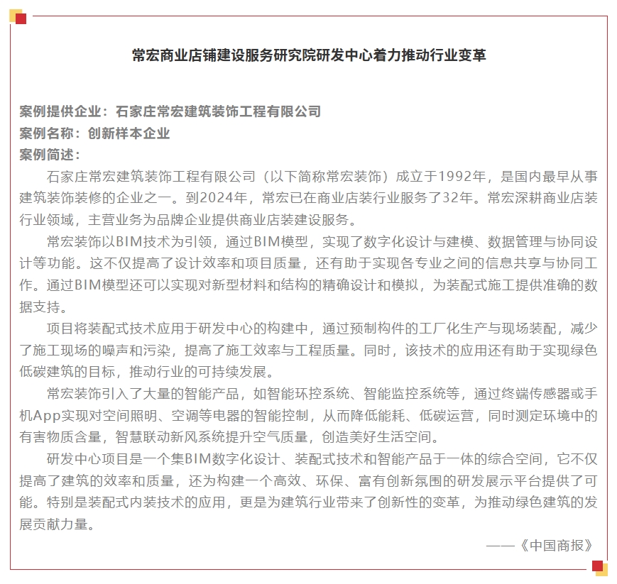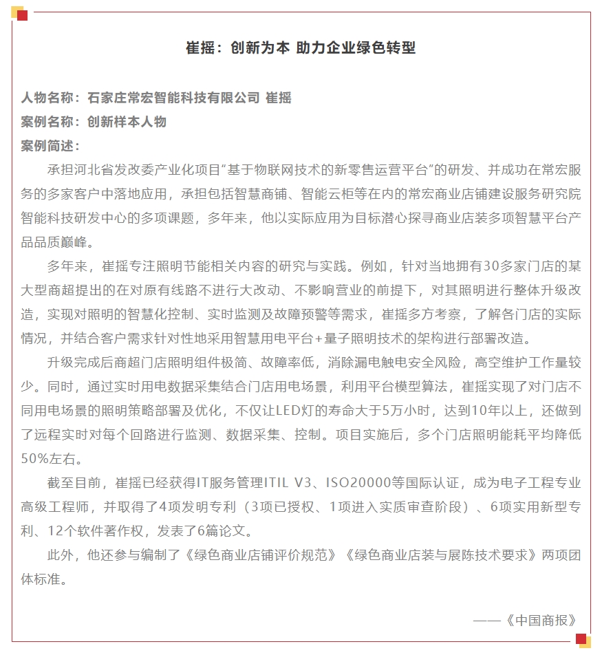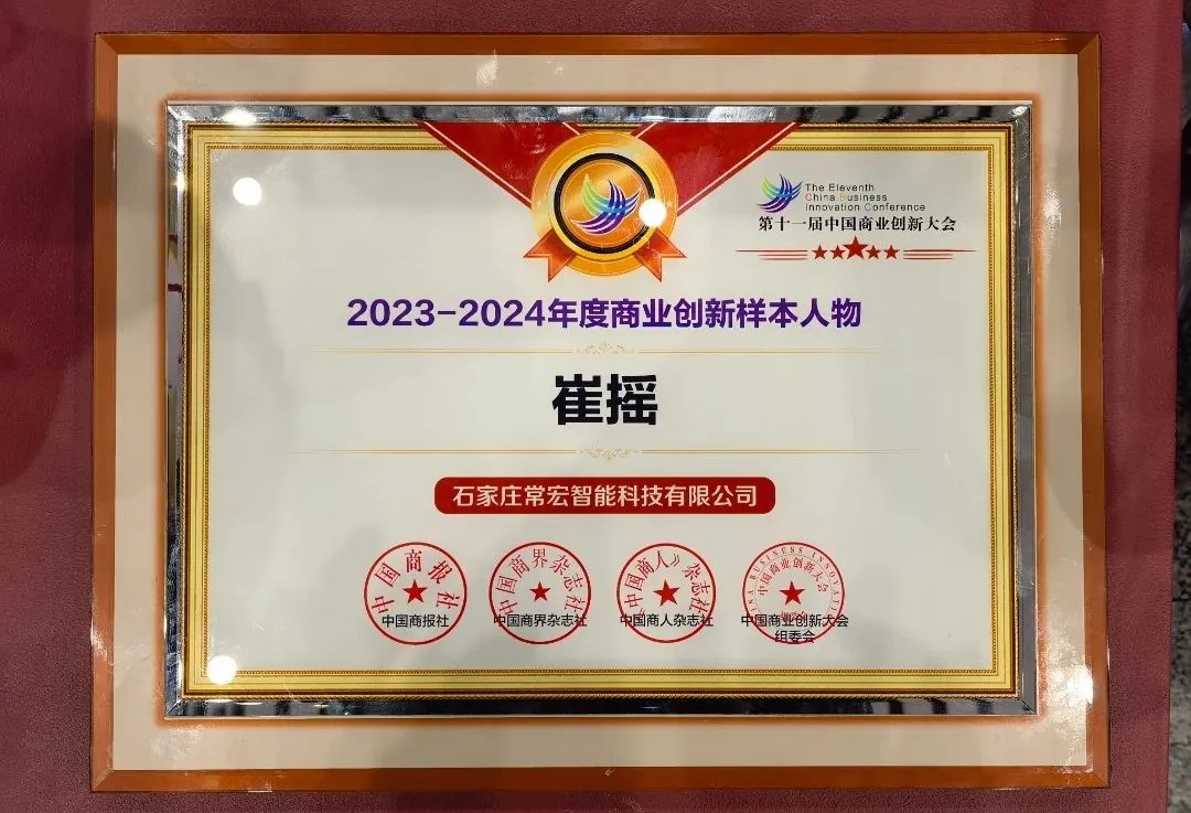 12月18日,在第十一屆中國(guó)商業(yè)創(chuàng)新大會(huì)上,對(duì)“2023-2024年度商業(yè)創(chuàng)新樣本優(yōu)秀案例”進(jìn)行了表彰和頒獎(jiǎng)。常宏集團(tuán)榮獲“2023-2024年度商業(yè)創(chuàng)新樣本企業(yè)”;常宏智能科技有限公司董事總經(jīng)理崔搖榮獲“2023-2024年度商業(yè)新銳創(chuàng)新人物”獎(jiǎng)。