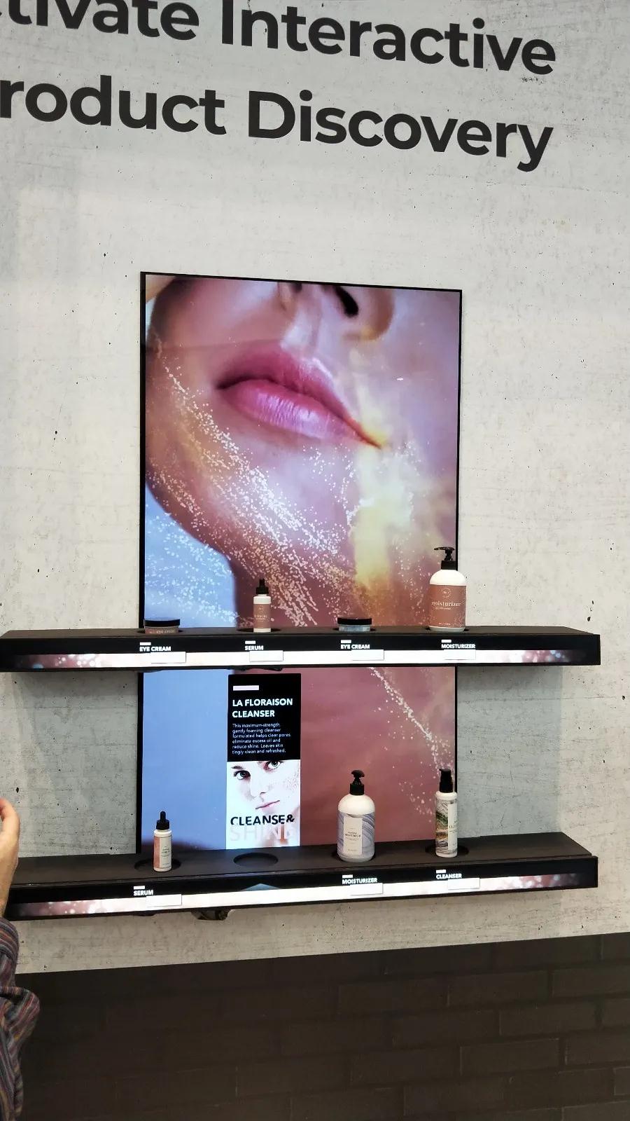 在它的旁邊是一款智能貨架,兩個(gè)層板上的產(chǎn)品均可以顯示價(jià)格,同時(shí)當(dāng)產(chǎn)品位置發(fā)生變換的時(shí)候,價(jià)格也跟著調(diào)整。背面是一整塊大屏幕,閑時(shí)播放產(chǎn)品廣告遠(yuǎn)距離傳播,當(dāng)有產(chǎn)品被拿取的時(shí)候大屏幕會(huì)以畫(huà)中畫(huà)的形式展示所拿取商品的信息。