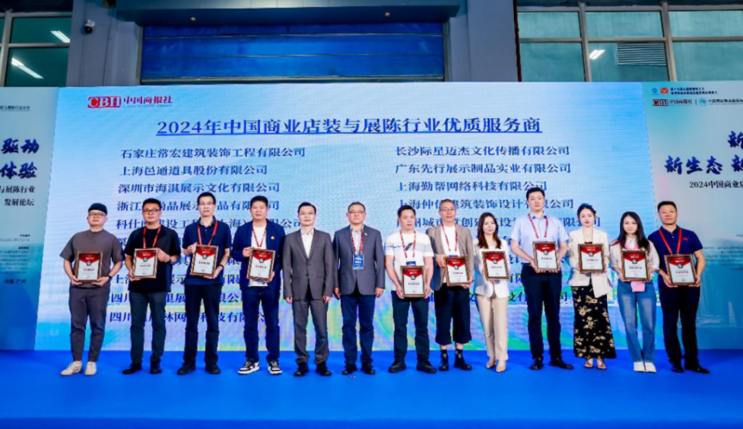 在5月30日于廣州舉辦第十七屆中國零售商大會的平行論壇——“新驅動 新生態(tài) 新體驗“2024中國商業(yè)店裝與展陳行業(yè)發(fā)展論壇上,現(xiàn)場揭曉了由中國商報社評選出的“2024年度中國商業(yè)店裝與展陳行業(yè)優(yōu)質服務商、供應商”名錄,中國商報社社長兼總編輯胡斌、中國商業(yè)聯(lián)合會商業(yè)店裝與展陳行業(yè)分會會長王躍為獲獎企業(yè)代表頒獎授牌。