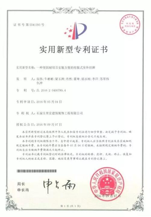 近日,常宏建筑裝飾工程有限公司榮獲由中華人民共和國(guó)國(guó)家知識(shí)產(chǎn)權(quán)局頒發(fā)的2項(xiàng)實(shí)用新型專利證書(shū)。分別為:一種弧型廣告牌,專利號(hào)為:ZL 2016 2 0189323.4,專利權(quán)期限為十年;一種堅(jiān)固耐用且安裝方便的組裝式室外招牌,專利號(hào)為:ZL 2016 2 0400789.4. 專利權(quán)期限為十年。在此我們表示熱烈的祝賀。